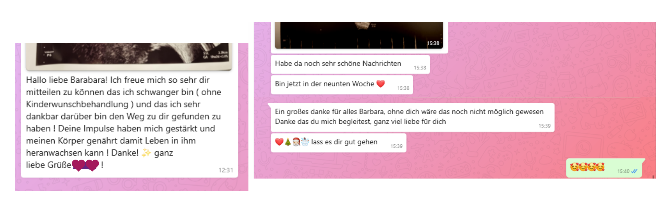 Zwischen den Treffen bin ich immer an deiner Seite. Fange dich auf, berate dich, höre dir zu. Du erhältst Übungen, Worksheets, Mediationen oder was auch immer du gerade benötigst. Außerdem kannst du mich jederzeit bei Fragen, Sorgen, beim Warten auf das Ergebnis des Schwangerschafttests oder was auch immer du gerade brauchst, per WhatsApp, Telegram oder E-Mail kontaktieren.